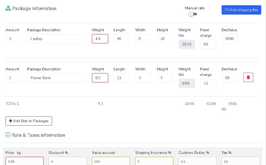 Convert your analog paper process to the new age of online logistic management system that handles everything from calculating shipping rate, taxes, fees, insurance, custom duties, declared values to package tracking system.