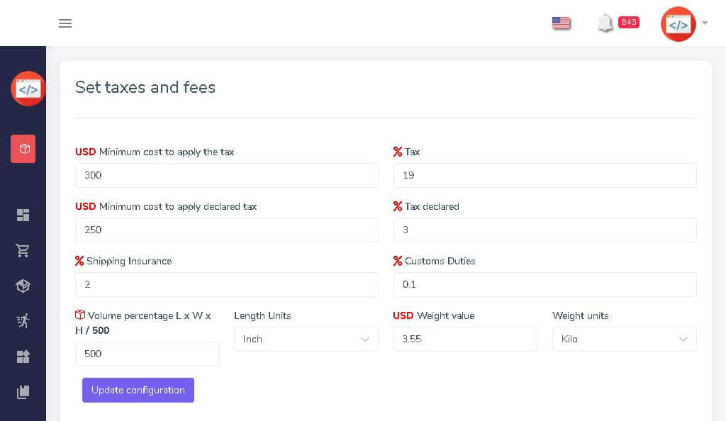 Let the system do the heavy lifting. Comprehensive setup fee, rate and taxes by weight, package source and destination, length and yet remain flexible for any intervention you need.